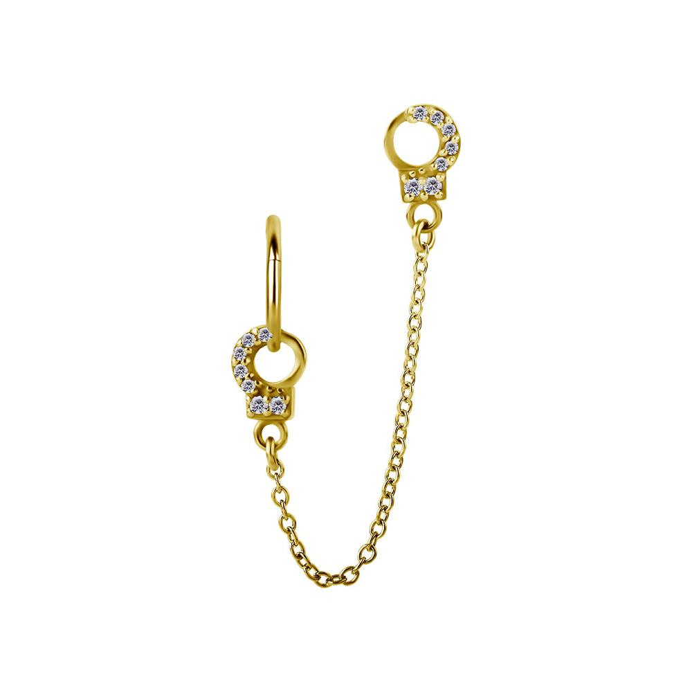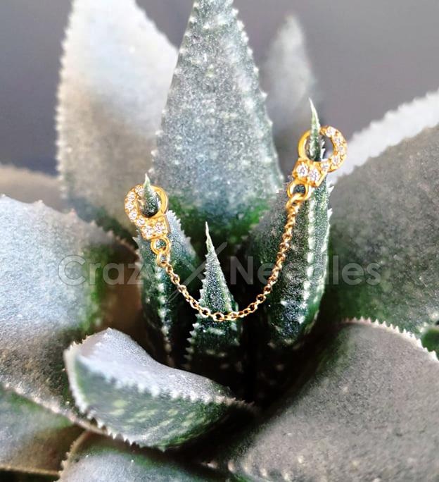 The presented gold chain was designed on the pattern of handcuffs. Its unique design is enriched with white zircons, adding a subtle sparkle to it. This unusual jewelry will allow you to experiment with different styles, allowing you to combine earrings placed in different parts of the ear. You can also use it to hang on barbs placed in an industrial type piercing, which will add a modern and bold touch to your look.