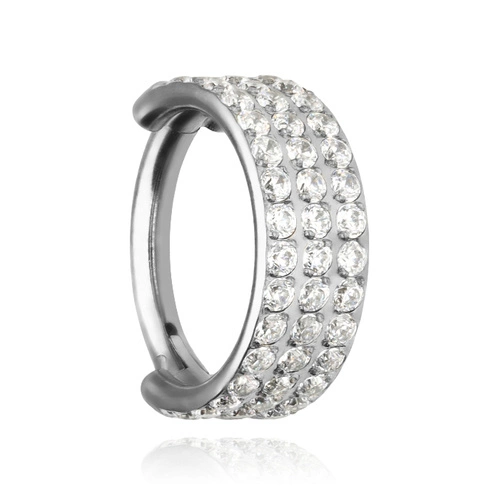 Titanium piercing ring clicker with three rows of zirconia - silver - TK-040