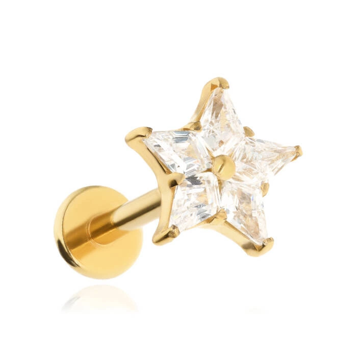 Tytanowy kolczyk labret gwiazda z białą cyrkonią - złoty