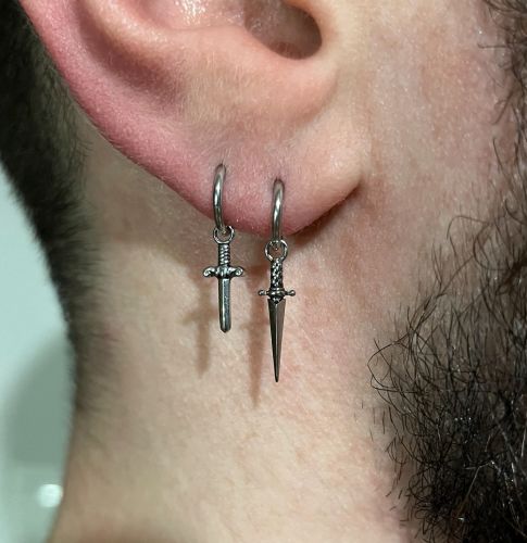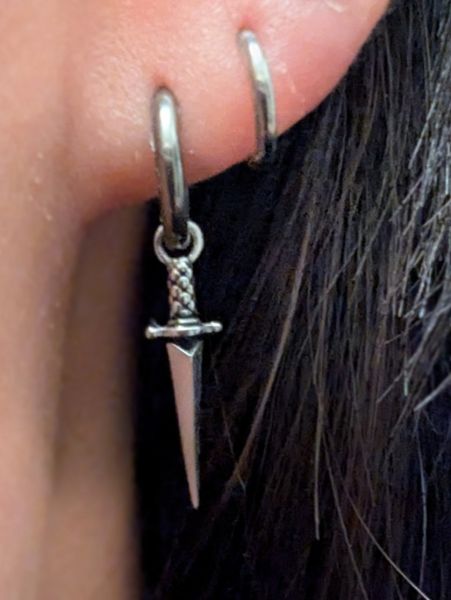 Cute little sword, currently wearing it in my lobes. Fits a 14g hoop perfectly!