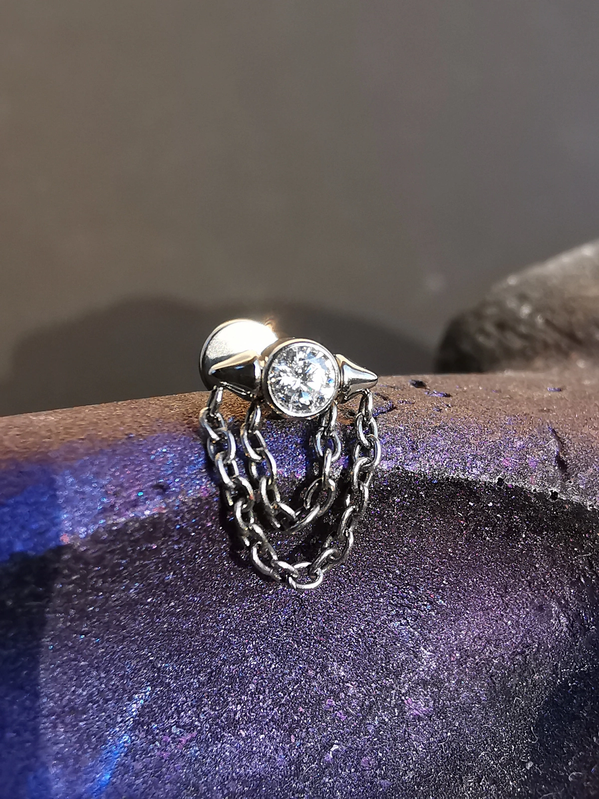 Tytanowy kolczyk labret z białą cyrkonią i łańcuszkami - srebrny