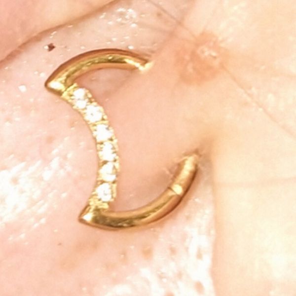 Prezentowany srebrny kolczyk, który możesz nosić na przykład w uchu lub w nosie, ma kształt przypominający księżyc. Jedna część ozdobiona jest dziewięcioma niewielkimi cyrkoniami o wyjątkowym blasku. Dzięki tej dekoracji biżuteria zyskuje przepiękny blask i przyciąga spojrzenia. Kolczyk clicker ma specjalny mechanizm, umożliwiającym łatwe i szybkie zakładanie i zapinanie, co ułatwia codzienne użytkowanie.
