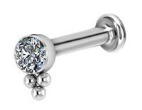 Tytanowy labret zachwyca starannym wykończeniem i wyjątkowym designem. Z jednej strony ozdobiony jest białą cyrkonią Premium Zirconia, która dodaje blasku, a z drugiej – płaskim dyskiem zapewniającym wygodę zakładania biżuterii. Trzy srebrne kuleczki dopełniają projekt, tworząc efektowny akcent.
